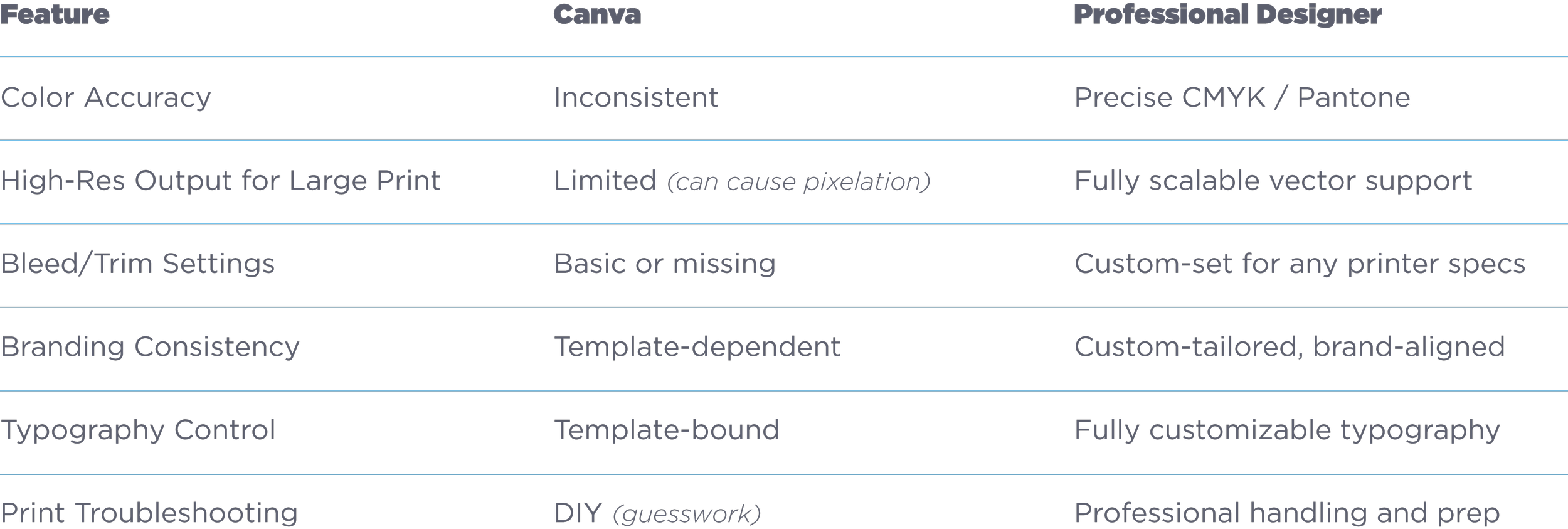 Think of Canva as a convenience tool, not a comprehensive solution. If you're on a tight timeline or budget and need something simple, Canva is great. But if you’re investing in high-impact, high-visibility printed materials, the cost of poor design or low-quality output could far outweigh the savings.